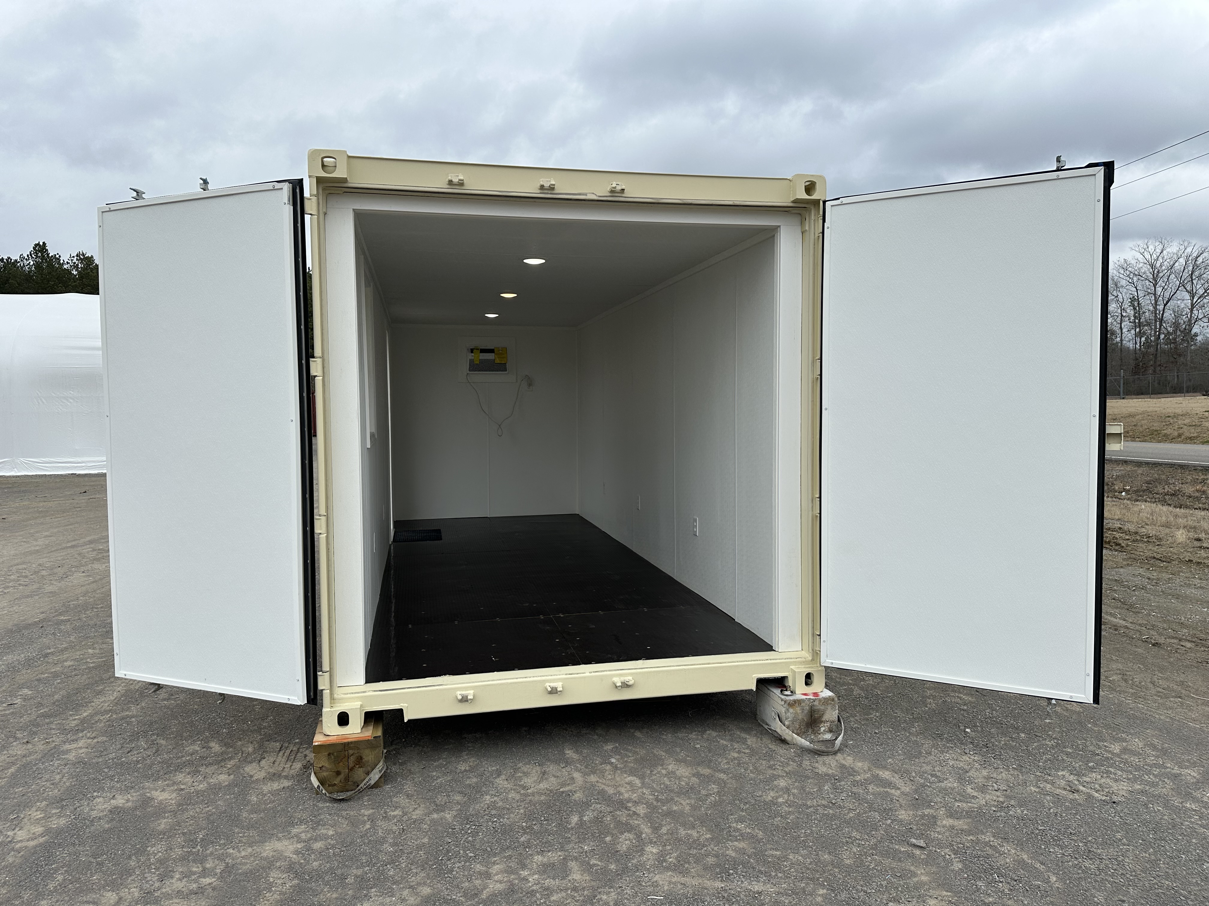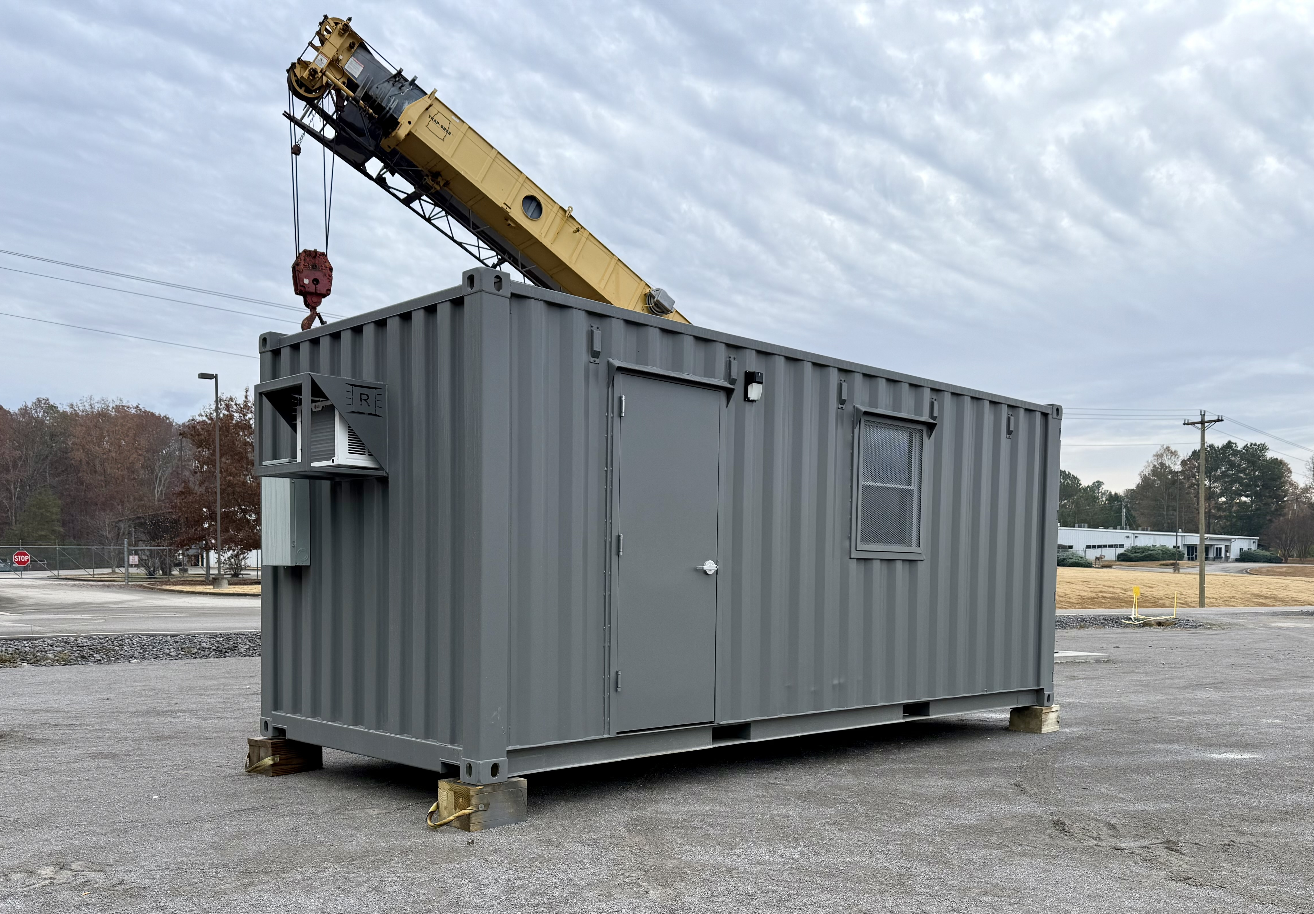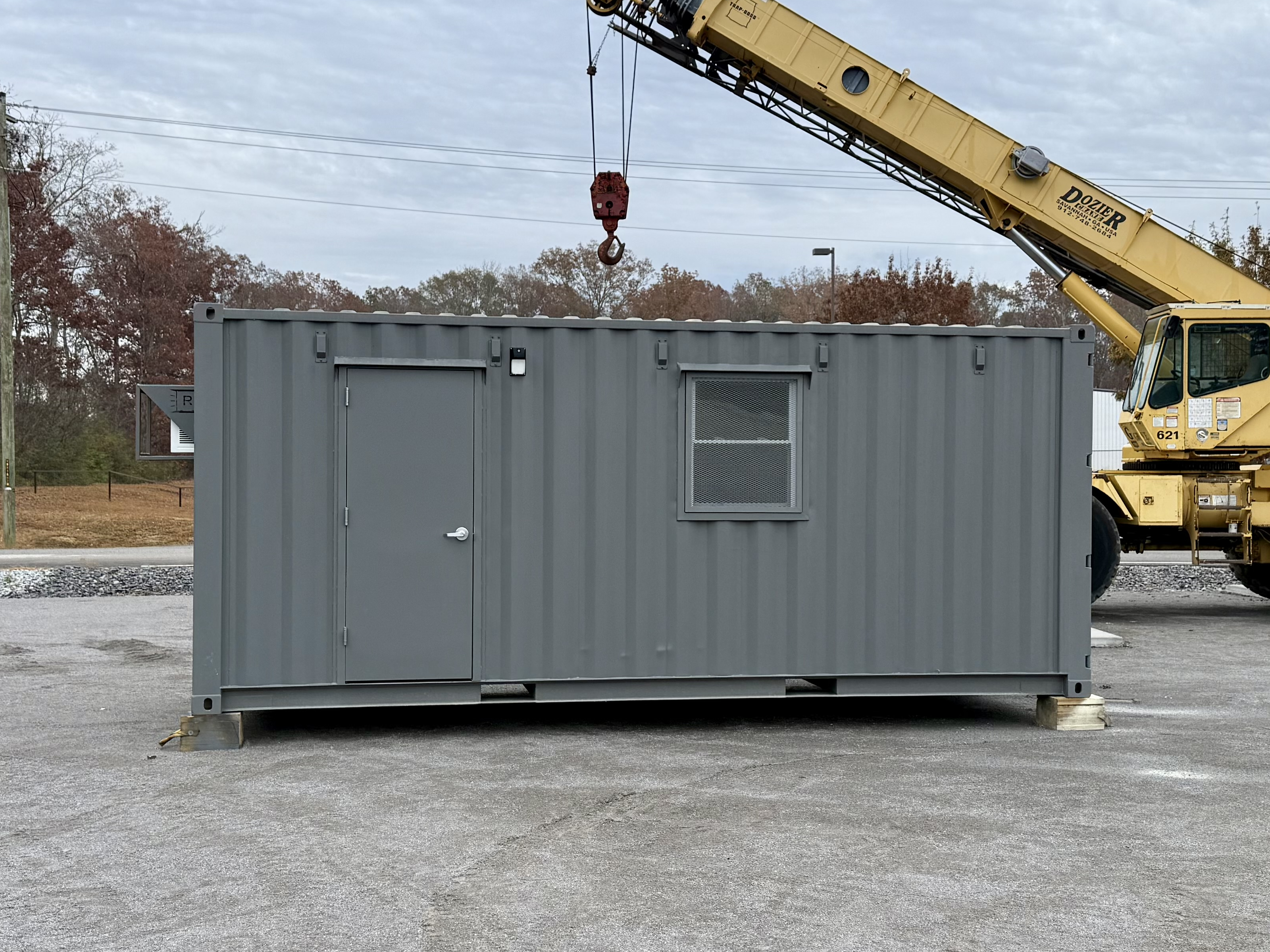 A 20' mobile office with plug & play utility hookups for a finished, climate controlled office.